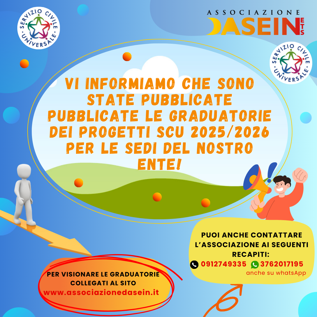 Vi informiamo che sono state pubblicate le graduatorie dei progetti SCU 2025/2026 per le sedi del nostro Ente. Per la consultazione collegati al sito riportato in locandina